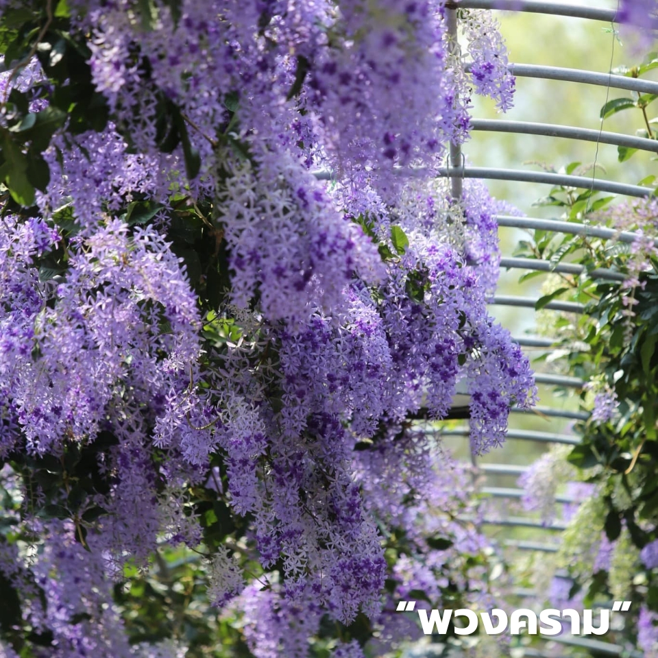 ตบท้ายด้วยไม้เลื้อยดอกอย่างต้นพวงคราม ที่นอกจากจะมีกลิ่นหอมแล้ว ยังเป็นไม้เลื้อยดอกเป็นช่อสีม่วงที่ดูละมุนตา แถมยังดูแลง่าย แข็งแรง ชอบแดดตลอดวัน นำมาตกแต่งทำซุ้มประตูทางเข้าสวนในบ้านสไตล์อังกฤษเข้ากันได้ดีเลยทีเดียว