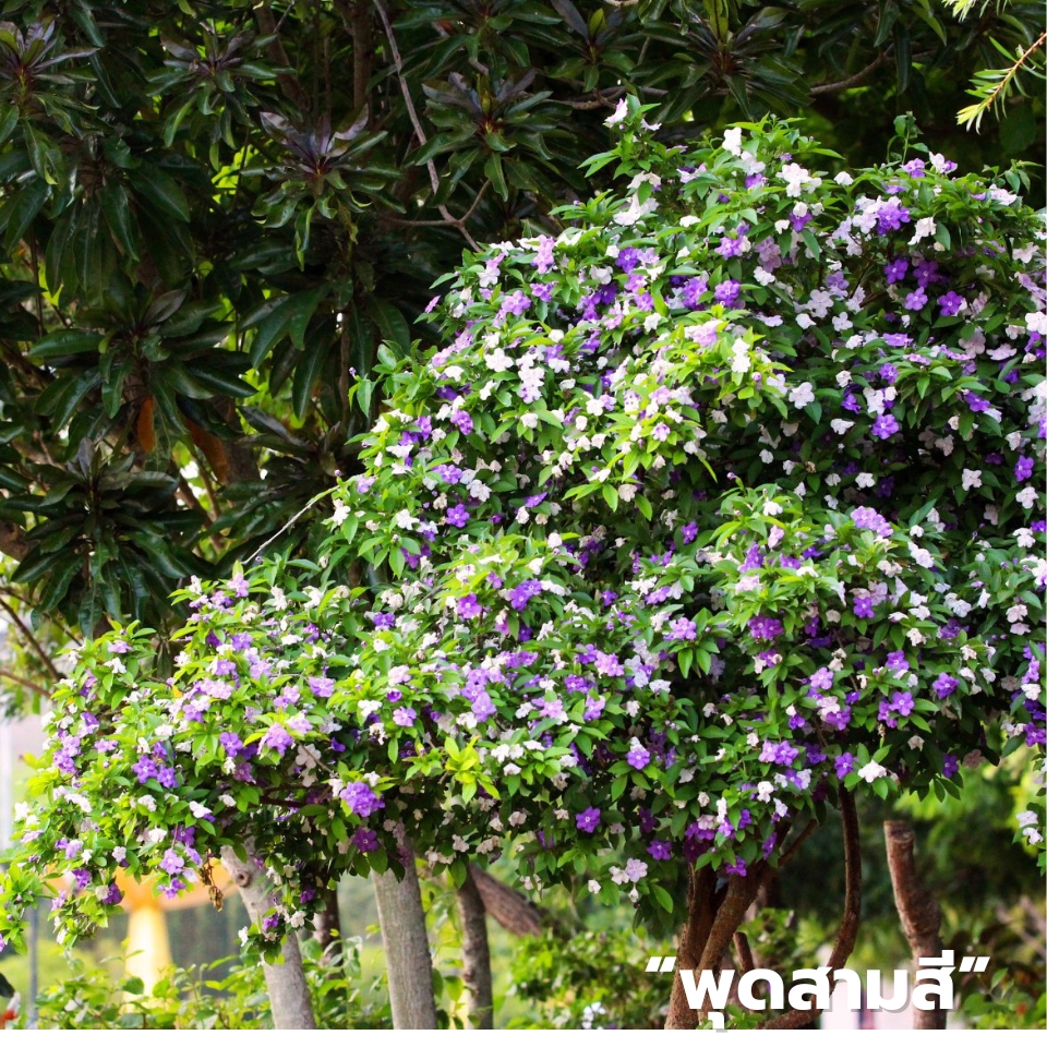พุดสามสี จะเป็นลักษณะของดอกแฟนซี คือ ภายในดอกเดียวจะเปลี่ยนสีได้ถึง 3 สี คือ ตอนบานใหม่ๆ สีม่วงเข้ม พอรุ่งขึ้นจะกลายเป็นสีม่วงอ่อน และวันต่อมากลายเป็นสีขาว แล้วพอขึ้นวันใหม่ดอกจะร่วง อันนี้เป็นเสน่ห์ของพืชชนิดนี้ และยังมีชื่อเรียกแตกต่างกันมากมาย เช่น พุดสี พุทธชาดม่วง พุทธชาดสามสี พุดสามราศี