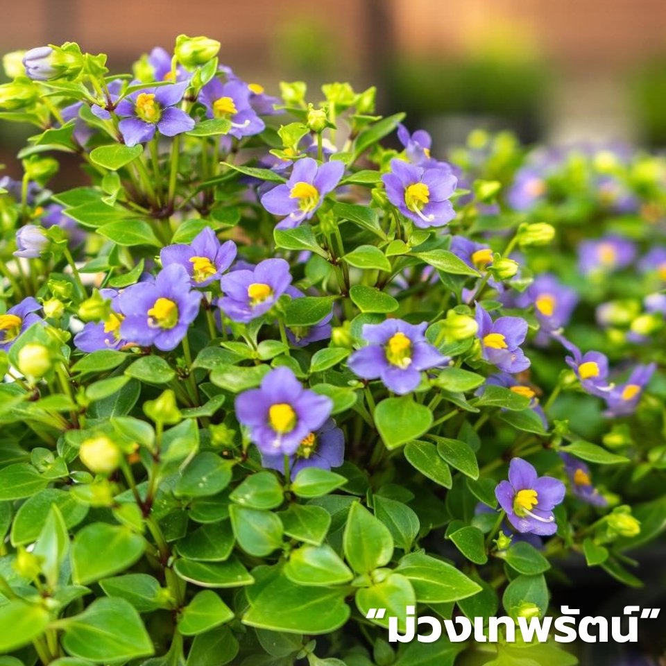 ม่วงเทพรัตน์" ไม้มงคลพระราชทาน จุดเด่นดอกสีม่วงอมฟ้า เกสรเหลือง กลิ่นหอมอ่อนๆ ซึ่งพืชมีถิ่นกำเนิดในเกาะ Socotra บนพื้นที่มรดกโลก ในมหาสมุทรอินเดีย ของประเทศ Yemen ส่วนในประเทศไทยมีการปรับปรุงพันธุ์ให้ทนร้อน ทนหนาวก่อนปลูกในอากาศบ้านเราได้ ดอกมีสีม่วงอมฟ้าหรือสีขาว เมื่อดอกบานเต็มที่มีลักษณะคล้ายรูปดาว เกสรเพศผู้สีเหลืองสามารถเห็นได้ชัดเจน ดอกมีกลิ่นหอมอ่อน ๆ