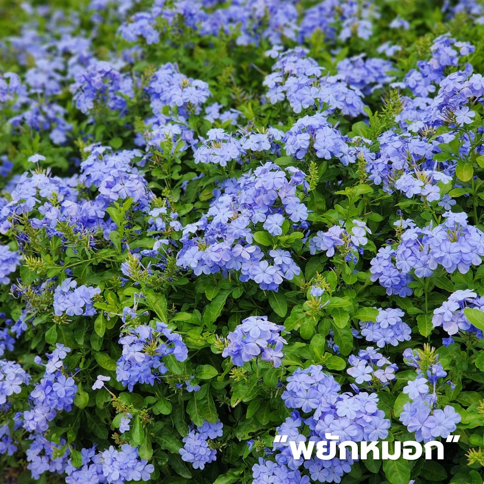 พยับหมอก มีจุดเด่นก็คือสีของดอก ที่มีสีฟ้าครามอมม่วงหรือสีฟ้าและขาว ซึ่งเป็นสีที่ไม่ค่อยพบเจอมากนัก ถือว่าเป็นเอกลักษณ์เฉพาะตัวเลยก็ว่าได้ โดยจัดว่าเป็นไม้พุ่มขนาดกลาง มีความสูงได้ถึง 1.5 เมตร ก้านเป็นพุ่มที่ค่อนข้างโปร่ง ใบเป็นรูปไข่แบบกลับหัว ด้านบนของใบจะมีสีเขียวสด ส่วนใบข้างล่างจะมีขนปกคลุมอยู่เล็กน้อย ออกดอกตลอดปี โดยเฉพาะในช่วงเดือน พ.ย.-ม.ค.