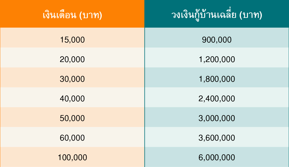จะสามารถขอวงเงินกู้ซื้อบ้านได้ประมาณ : (30,000 x 40%) x 150 = 1,800,000 บาท