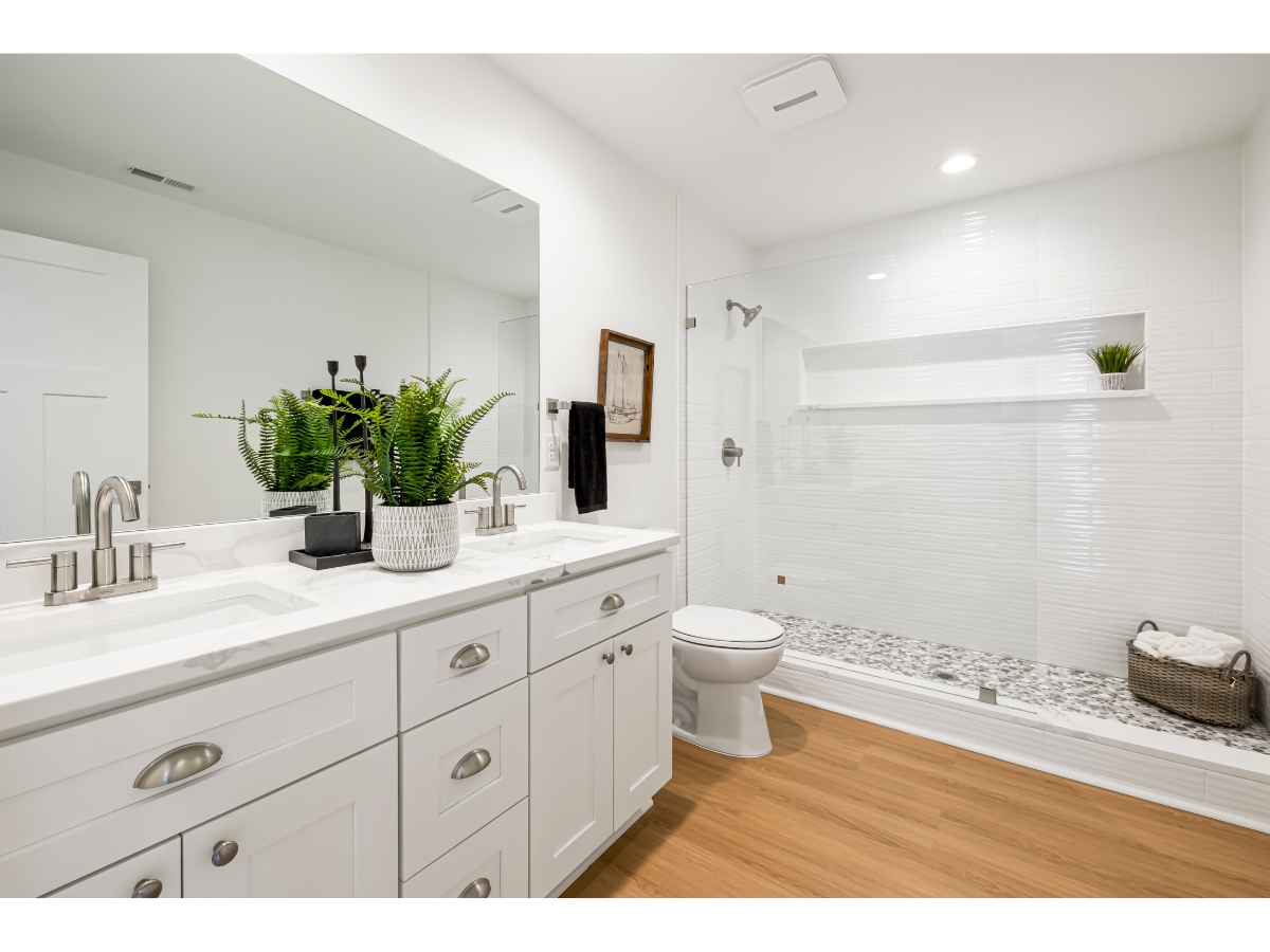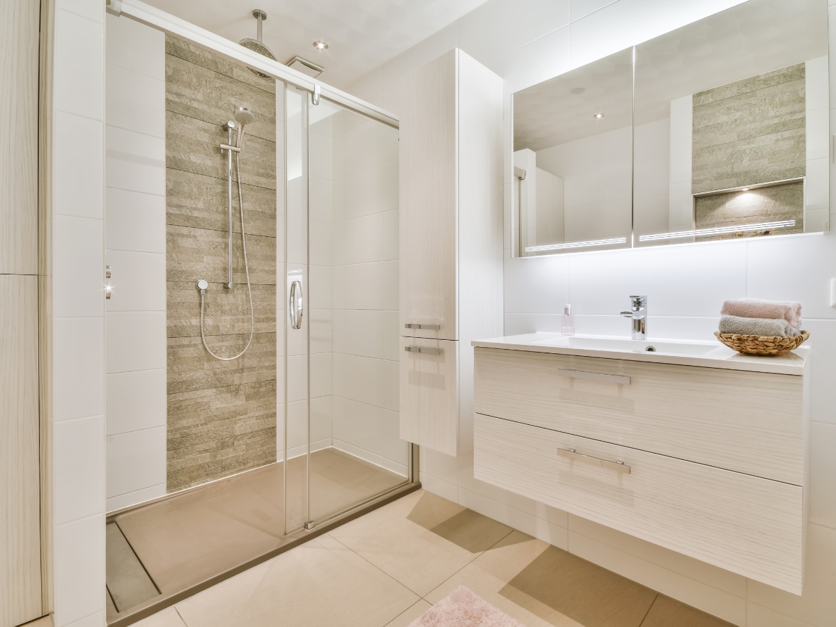 ติดตั้งกระจกบานใหญ่บนผนังเพื่อสร้างความรู้สึกกว้างขวาง กระจกสะท้อนแสงช่วยเพิ่มความสว่างและทำให้ห้องน้ำดูใหญ่ขึ้นและโปร่งสบาย